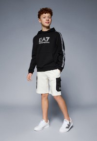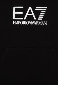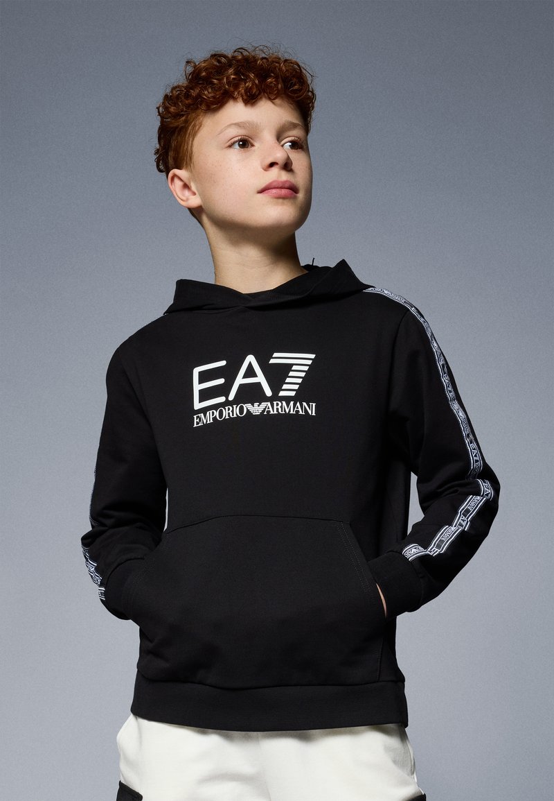 Black hooded sweatshirt with kangaroo pocket, featuring white EA7 logo and patterned accents along sleeves. Smooth texture, relaxed fit.