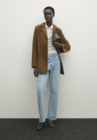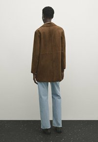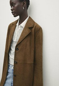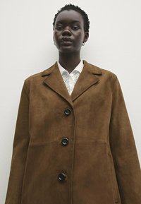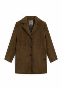 Long coat made of goatskin with suede finish. Notched lapel collar. Three-button fastening. Two side pockets. Hem with back vent. Lined.