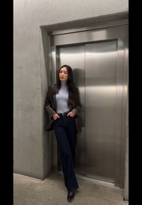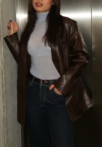 • Young woman wearing a brown leather blazer, light blue roll-neck jumper, and dark jeans, standing with one hand in pocket and the other raised.