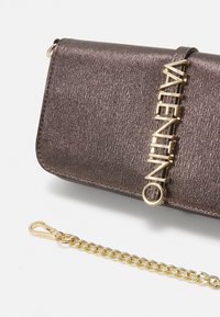 Metallic bronze crossbody bag with a textured finish, gold chain strap, and embossed "VALENTINO" logo on the front. Compact rectangular shape.